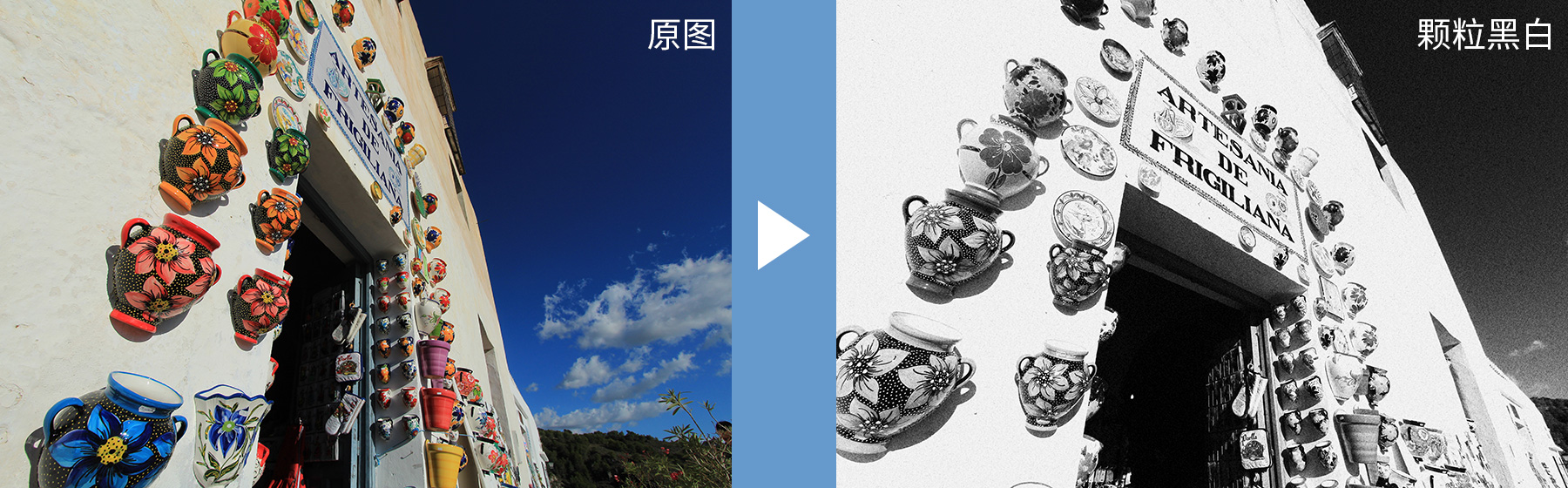 用相机加工所拍照片,通过颗粒黑白、柔焦、鱼眼效果、玩具相机效果、微缩景观效果共5种风格,获得艺术性效果。