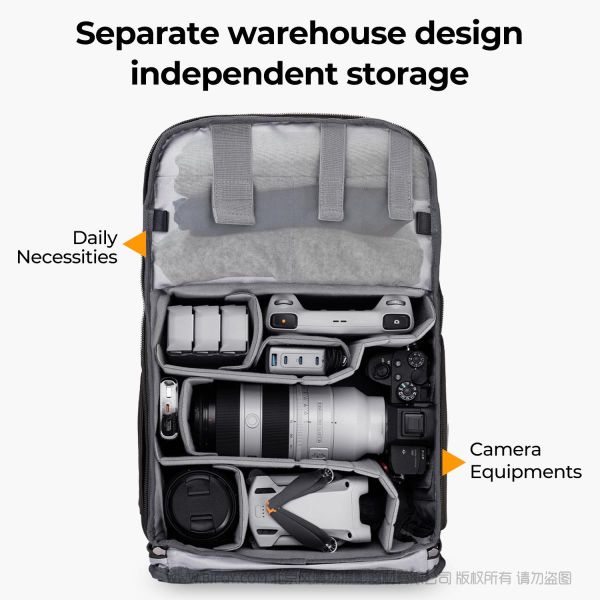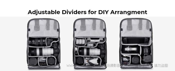 - * 【侧面通道和背部完全拉链】快速侧面通道让你在穿着时快速获取装备,捕捉更多美丽的时刻;专业背部全开放式设计让您可以轻松整理所有隔间和设备,同时为您的贵重物品提供较大的保护;两个额外的辅助带子有助于随时随地清晰轻松地整理您的所有装备。