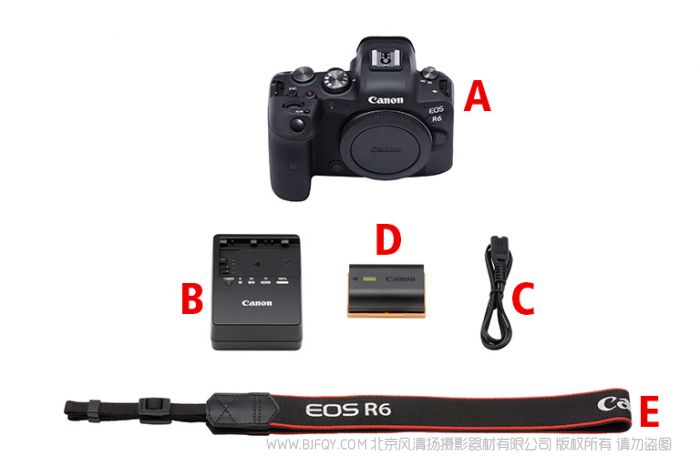 ![]() | A.EOS R6机身 B.电池充电器 LC-E6E C.电池充电器电源线 D.锂电池 LP-E6NH E.相机背带 |