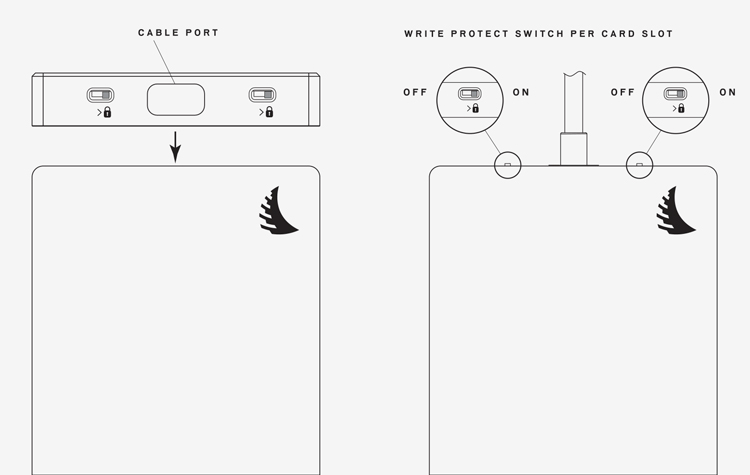 我们的 SD 双卡读卡器的每个卡插槽都配有一个写保护开关,可防止意外删除文件,并防止您的系统将不需要的数据文件写入您的卡。