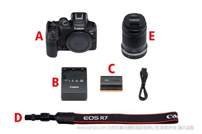 ![]() | EOS R7套机附件图(RF-S18-150mm F3.5-6.3 IS STM)A. EOS R7机身 B.电池充电器LC-E6E(含电源线) C.锂电池LP-E6NH D.相机背带 ER-EOSR7 E. RF-S18-150mm F3.5-6.3 IS STM | 11399元 |