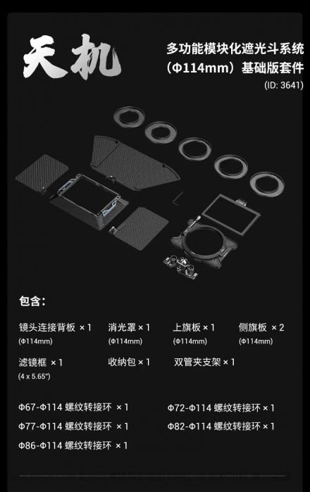 得利于滤镜系统贴合镜头设计,可满足≥14mm焦段,超广视角拍摄体验;消光罩采用磁吸对位和快拆安全锁设计,1秒2步快速拆装;碳纤维上旗板整体支持0-180°上下翻转,并可向两侧延伸0-38°遮光区域,侧旗板支持0-180°水平翻转;标配双管夹支架 ID:3652 可配合遮光斗有效的支撑保护镜头;天机遮光斗系列大量应用轻量化的镁合金和碳纤维材质,可为用户带来极致的轻量化拍摄体验;