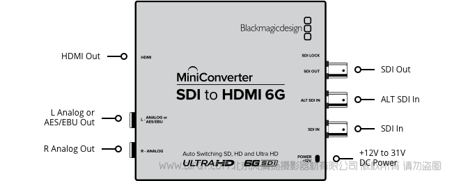 BMD Mini Converter SDI to HDMI 6G SD、HD、3G A级或B级以及6G-SDI视频源,转换成SD、HD和Ultra HD视频格式的HDMI视频