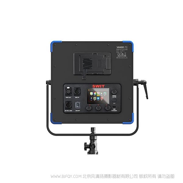 VANGO-70背面控制面板提供DMX512输入&输出接口,四芯卡侬11-34V宽电压输入,标配V字电池扣板(可选安顿型扣板),并提供了3.5英寸大彩屏,无需连接手机即可直观调色。支持USB-A口固件升级、用户自定义光效导入,或给无线DMX接收器供电。
