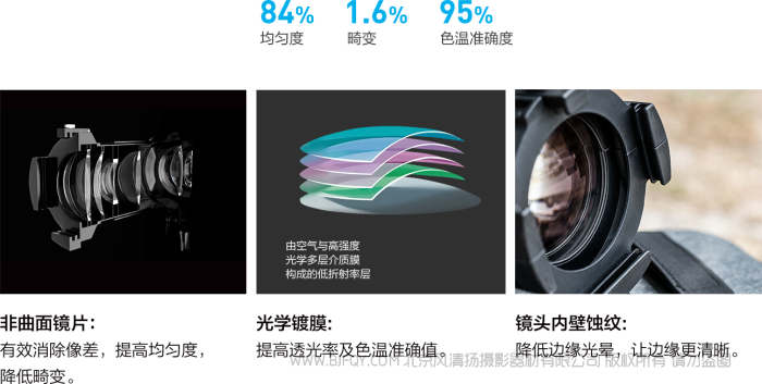 光学系统中加入用于矫正像差的非曲面镜片,同时搭配光学镀膜及镜头内壁蚀纹,给使用者
