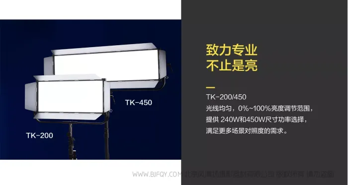 TK-200/450光线均匀,0%~100%亮度调节范围提供240W和450W尺寸功率选择满足更多场景对照度的需求。