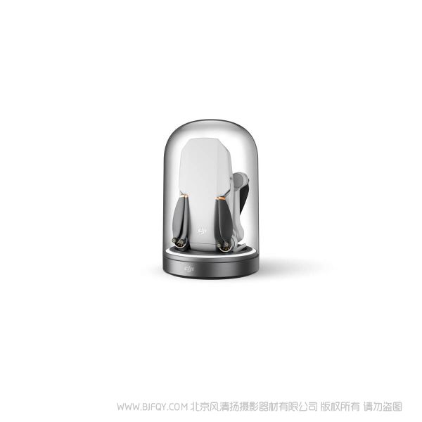 充电底座连接DJI 18W USB充电器和标配的电源线即可为飞行器充电。配合磁吸充电头,飞行器放置在充电座上时会自动吸附,轻松立起固定。