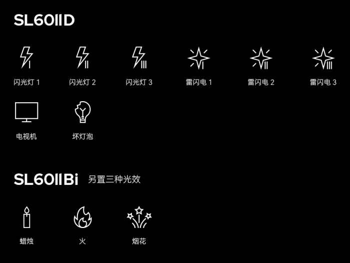 SL60IID内置8种FX光效,SL60IIBi配备了多达11种,可以逼真模拟灯泡、蜡烛、烟花、火焰等场景光效,助您将创意落地。