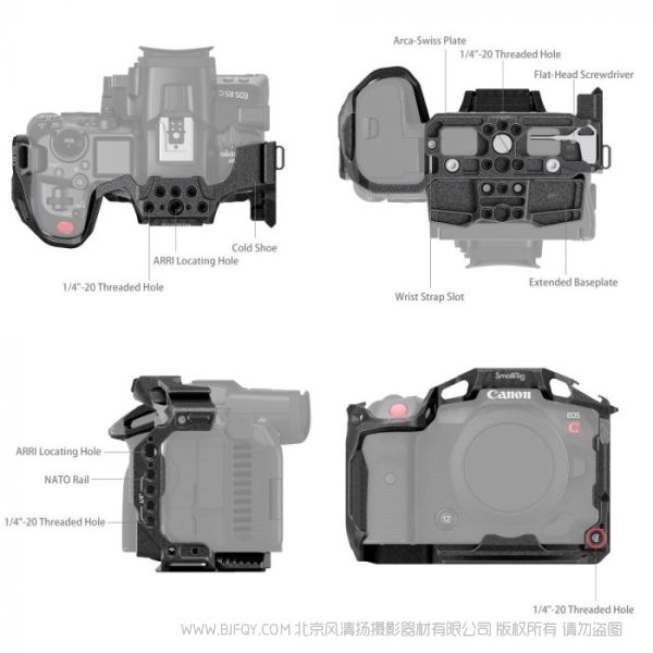 SmallRig 佳能EOS R5 C“黑曼巴“拓展框 3890 为相机提供保护以及多种拓展接口而设计。 通过底部一颗 1/4”-20 螺丝、定位柱以及左侧肩带孔锁紧相机,并多处内置硅胶垫片以防止刮伤相机。拓展框由前拓展框和后部拓展板两部分组成,两者的不同组合,可为场景拍摄方案提供多样性;拓展框整体延续黑曼巴风格,可访问相机顶部全部按键。前部采用红圈元素,与相机机身呼应;拓展框内置1/4”-20螺纹孔、3/8”-16螺纹孔可拓展侧手柄HSN2093、3260,上手提3786,魔术手2070,监视器支架2903,供电底座3168,充电宝夹2336,管夹3276等;内置冷靴接口可拓展麦克风、补光灯;内置滑条接口可拓展侧手柄2187、3260、3813;内置腕带和肩带接口,可搭配腕带3848,肩带PSC2428使用。底部内置阿卡,可直接上RS 2/RSC 2稳定器和阿卡脚架,实现手持、稳定器、三脚架场景快速切换。后部拓展板可拆卸设计,既可以平衡重心提升稳定性,又可拆卸后,安装在机身或拓展框底部当作垫高块使用。此外,拓展框内置双头扳手,便于拓展框的取用和拆卸。
