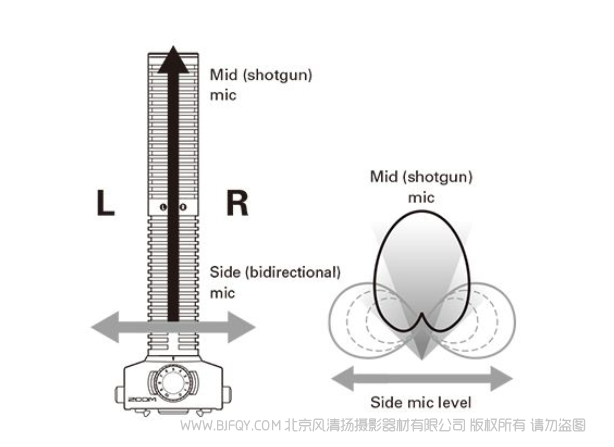 这款超定向立体声枪式话筒头可连接到 H5/H6/H8 手持录像机、Q8/Q8n-4K 手持录像机、U-44 音频接口和 F1/F4/F8/F8n 现场录像机。 它使用MS立体声系统,该系统结合了拾取中心声音的超定向霰弹枪式麦克风(Mid)和拾取左右声音的双向麦克风(Side)。 通过调整侧麦克风的输入电平,您可以自由更改立体声宽度。 此外,支持“MS-RAW”模式录制的录音机“H5”、“H6”、“F4”、“F8”和“F8n”可以在录制后调整立体声宽度。 您可以使用枪式麦克风瞄准特定声音,并在需要时混合 Side 麦克风拾取的环境声音。