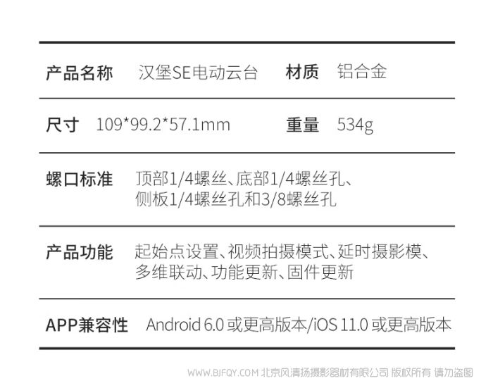 | 产品功能 | 起始点设置、视频拍摄模式、延时摄影模式 多维联动、功能更新、固件更新 |