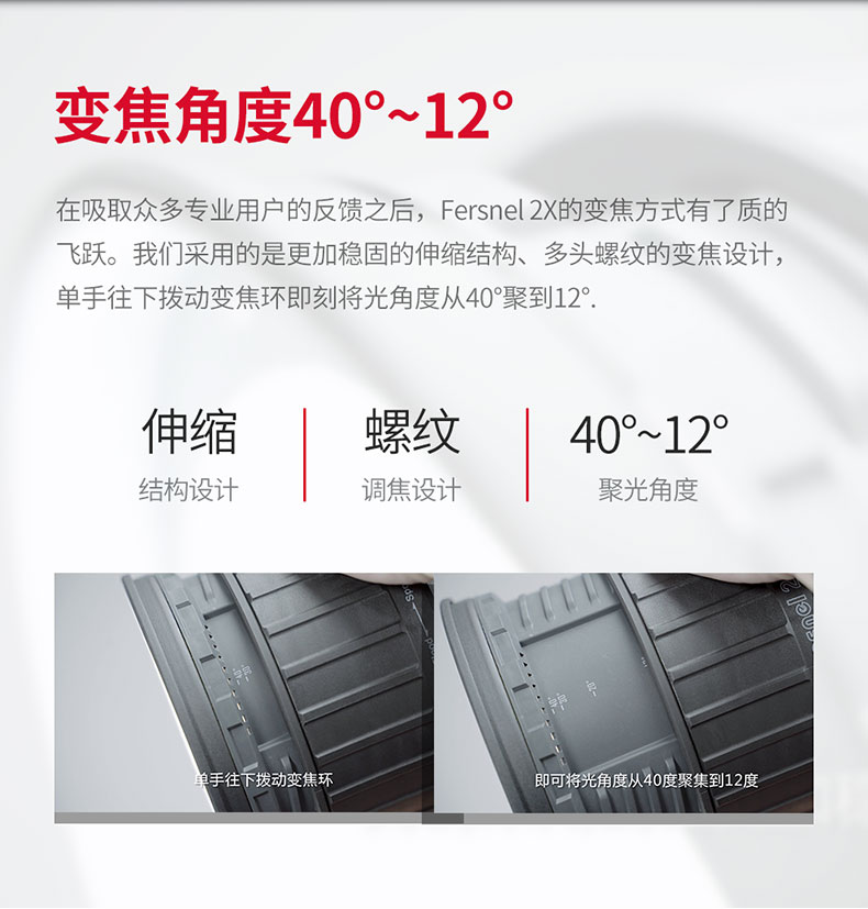 在吸取众多专业用户的反馈之后,Fersnel 2X的变焦方式有了质的飞跃。我们采用的是更加稳固的伸缩结构、多头螺纹的变焦设计,单手往下拨动变焦环即可将光角度从40度聚到12度。