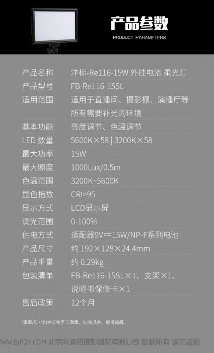 产品名称 | 沣标-Re116-15W 外观电池 柔光灯 |