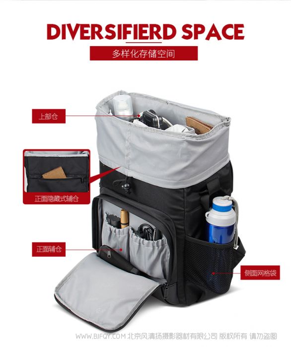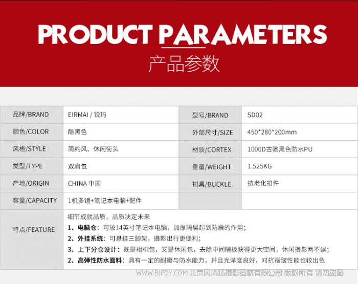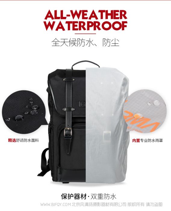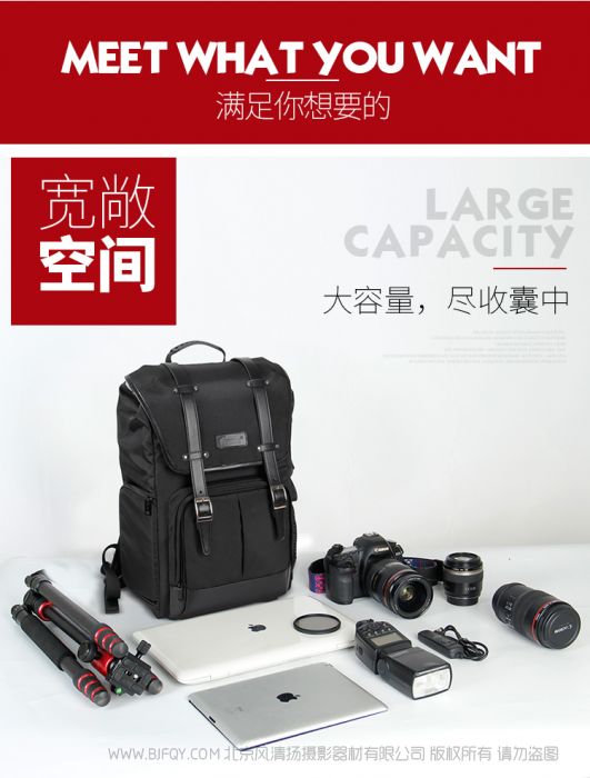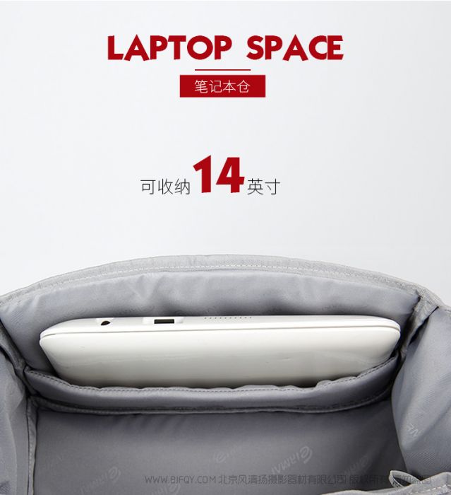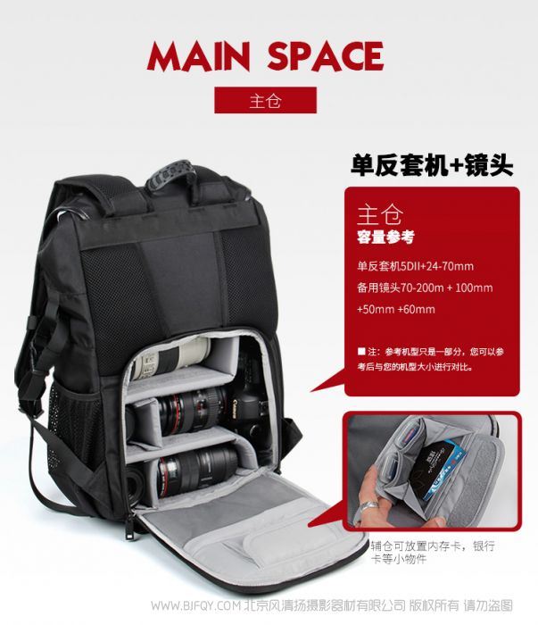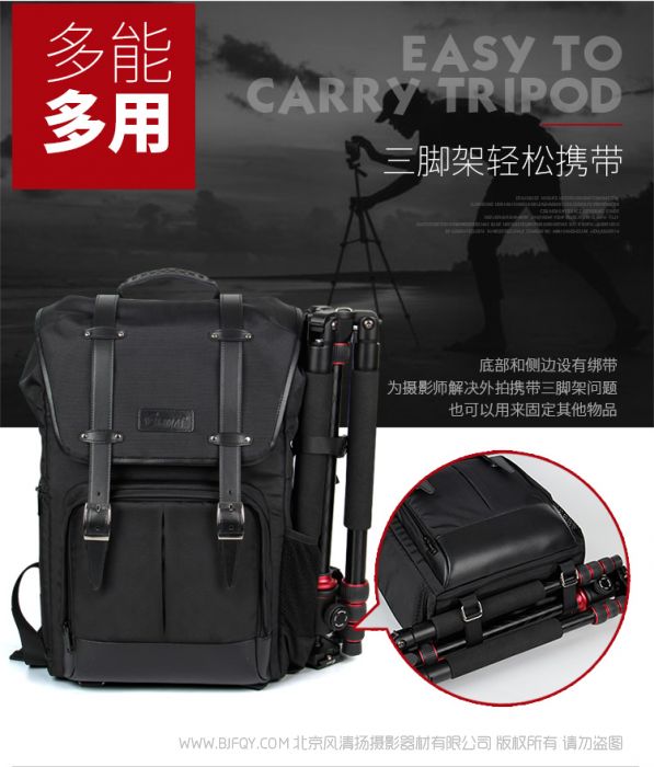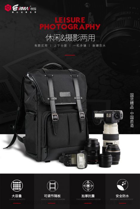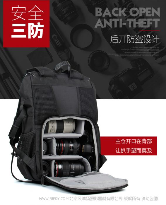 | 特点 | 细节成就品质,品质决定未来 1 点脑仓 k可放 14英寸笔记本电脑,加厚隔层起到防震作用; 2 外挂系统 可悬挂三脚架,摄影出行便利 3 上下分仓设计 既是相机包,又是休闲包,去除中间隔板获得更大空间,休闲摄影两不误 4 高弹性防水面料,具有一定的耐磨和防水能力,并且光泽良好,对抗这种性能较出色 | ||