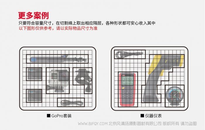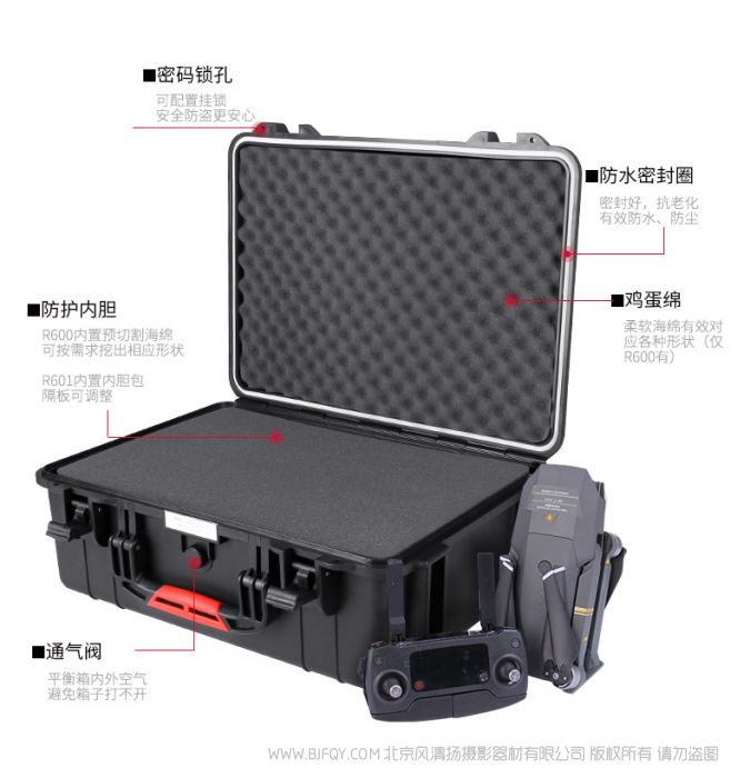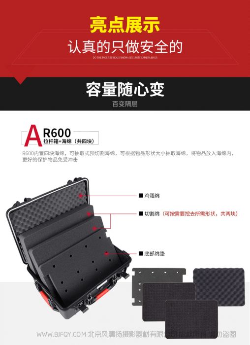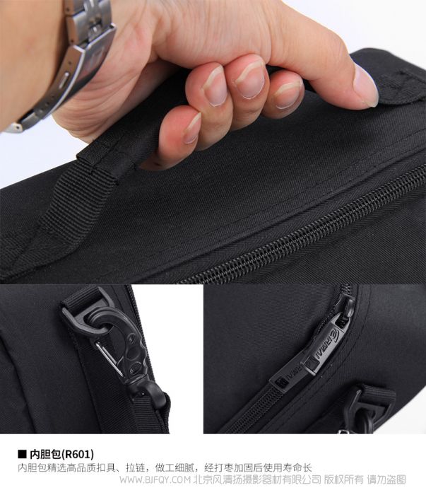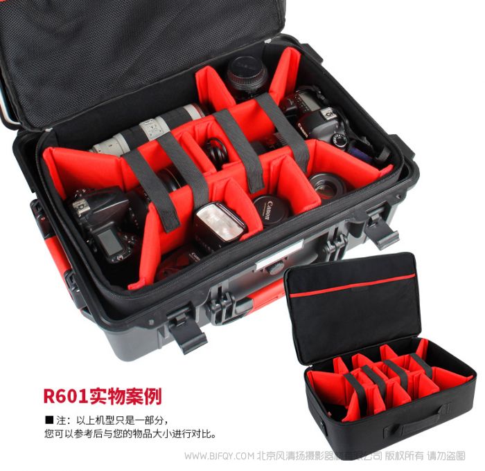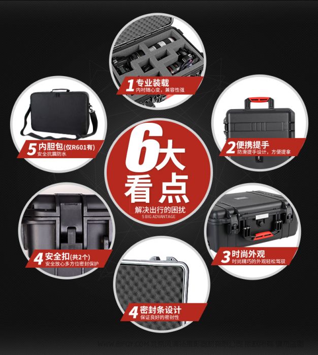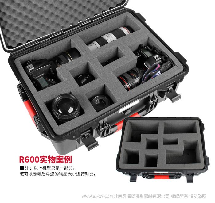 扣具 | 高品质精品扣具 | 容量 | R600 :内衬切割棉百变多样,可根据用户所放物品,挖出相应形状; R601:内胆包隔板可拆卸组装, 可装载gopro DJI相机,相机 以及镜头数码配件,仪表仪器,医疗设备 |