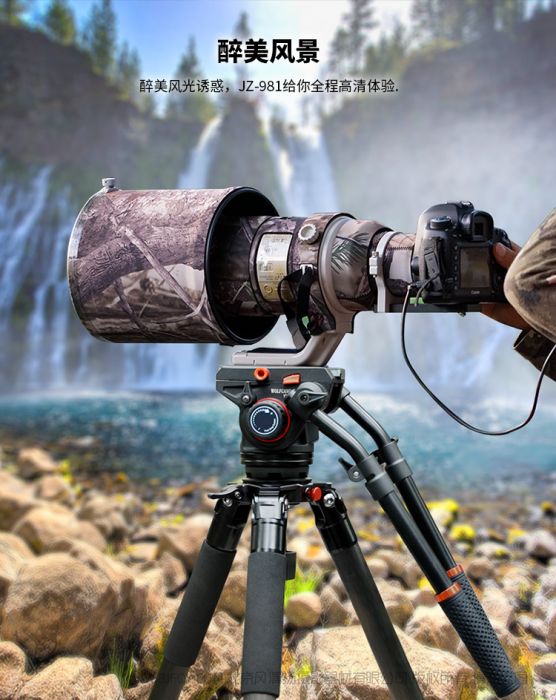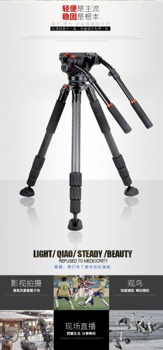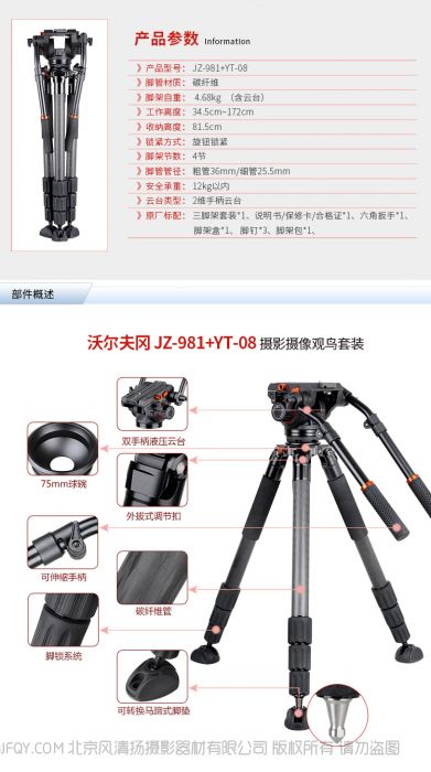 型号:JZ-981+YT06 材质:碳纤维 节数:4 较大管径:36mm 较小管 径:25.5mm 较大高度 1.72米 折叠高度:82.5cm 自重: 4.7kg 承重:12kg