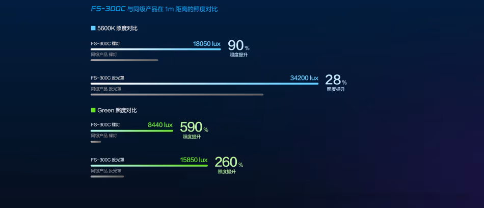 为确保在各个模式下都有高亮的照度输出,FS-300C沿用了高功率比的灯珠排布设计,并通过优异的光学混光设计,