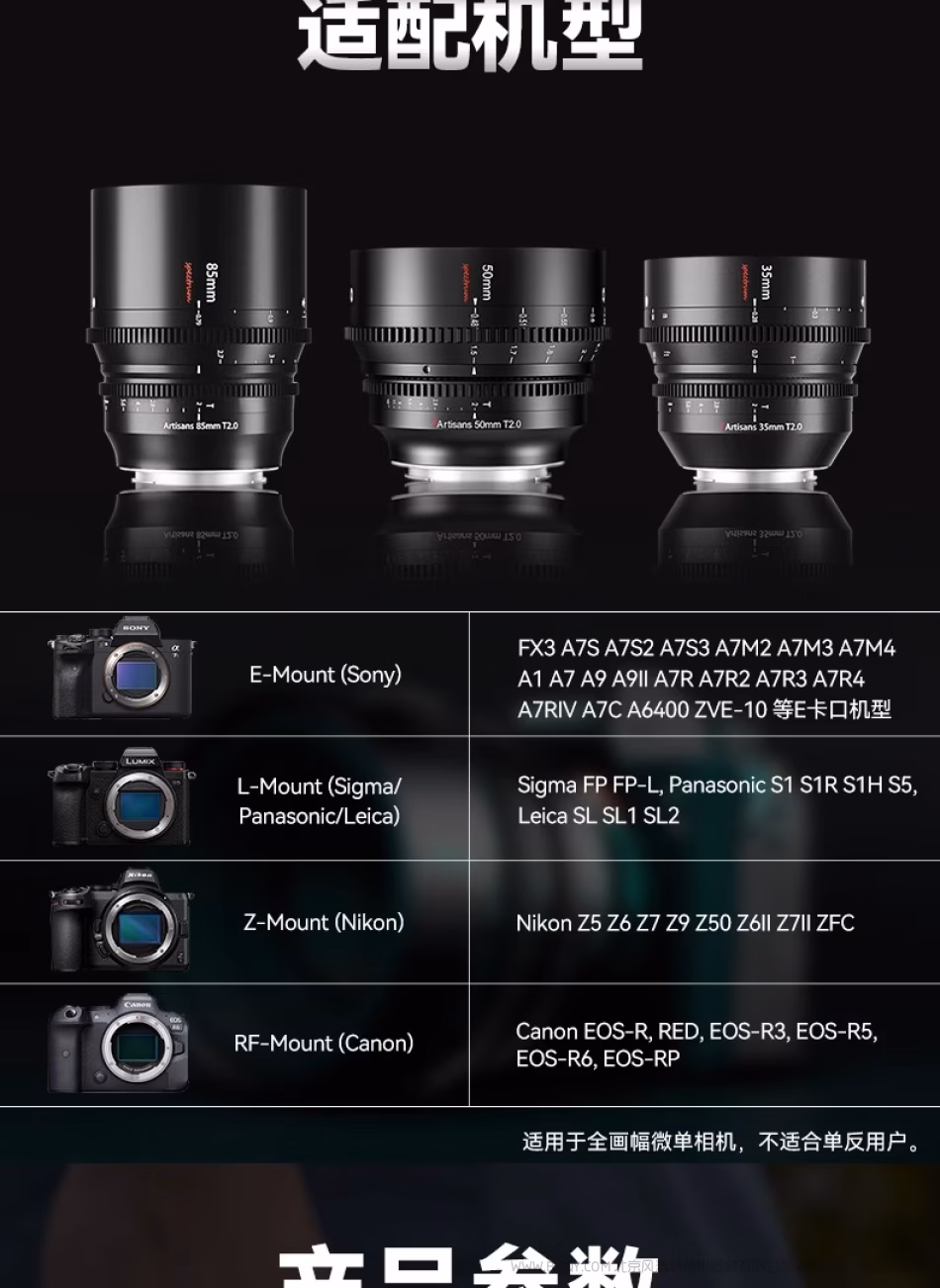 | 镜头型号 | 14mm T2.9 APSH | 35mm T2.0 | 50mm T2.0 | 85mm T2.0 | 120mm T2.9 Macro 2X |