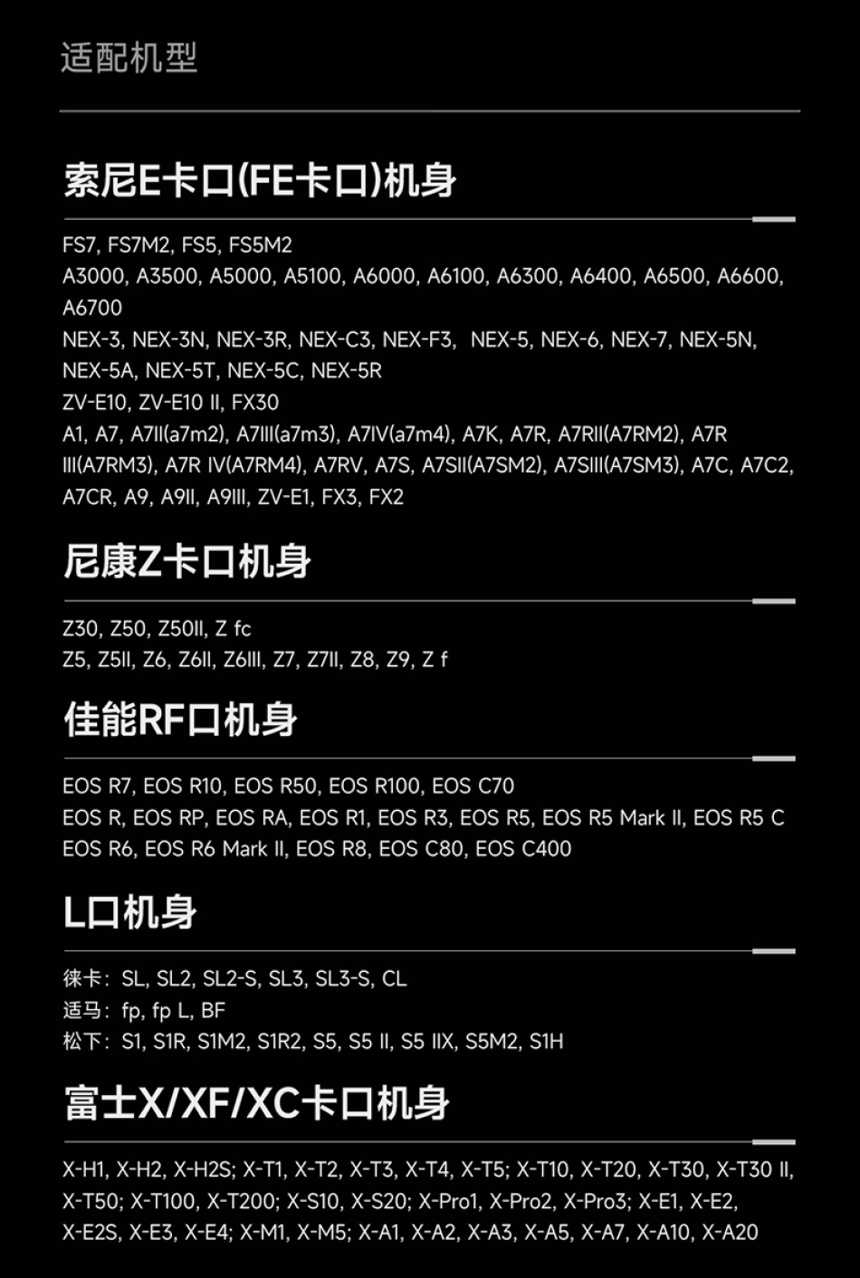 Ⅲ(A7RM3),A7R IV(A7RM4),A7RV,A7S,A7SI(A7SM2),A7SII(A7SM3),A7C,A7C2,