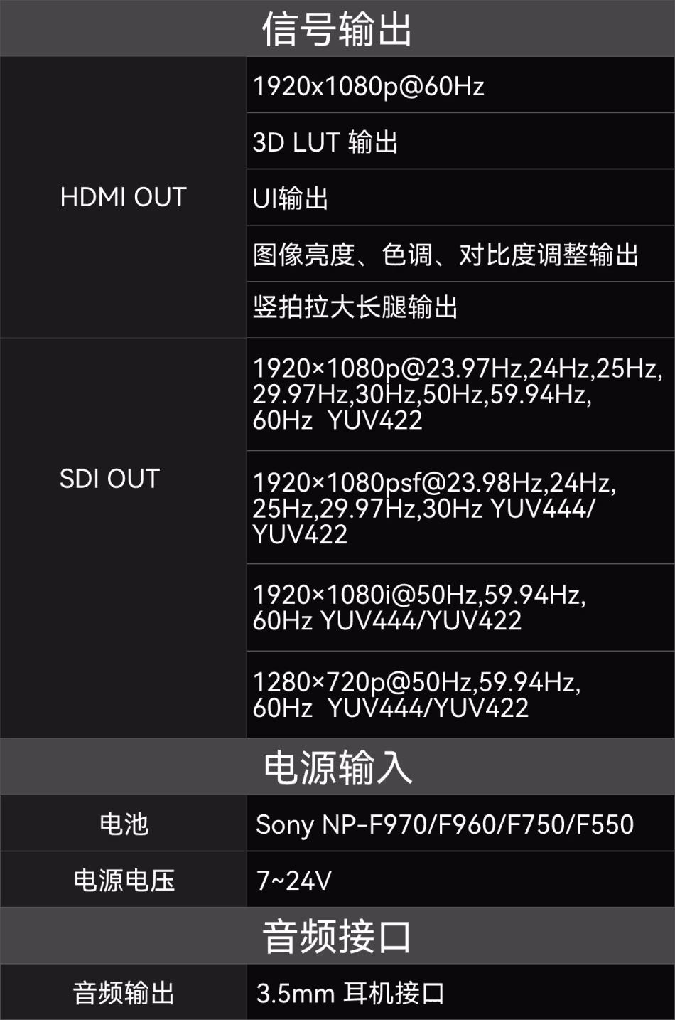 | HDMI OUT | 1920x1080p@60Hz 3D LUT 输出 UI输出 图像亮度、色调、对比度调整输出 竖拍拉大长腿输出 |