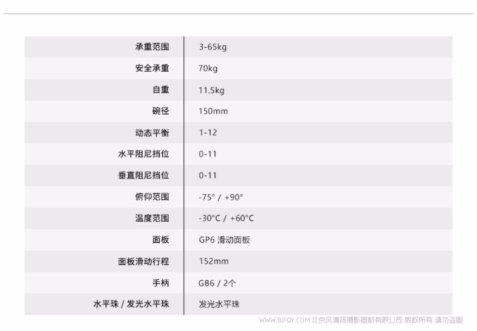 此外,它还设计有俯仰安全锁定和面板安全释放装置,以确保相机安全。相机快装面板的两侧有刻度,并具有152mm的滑动行程。内置照明水平仪可帮助在黑暗中进行平衡,并配备了可伸缩的双手柄。