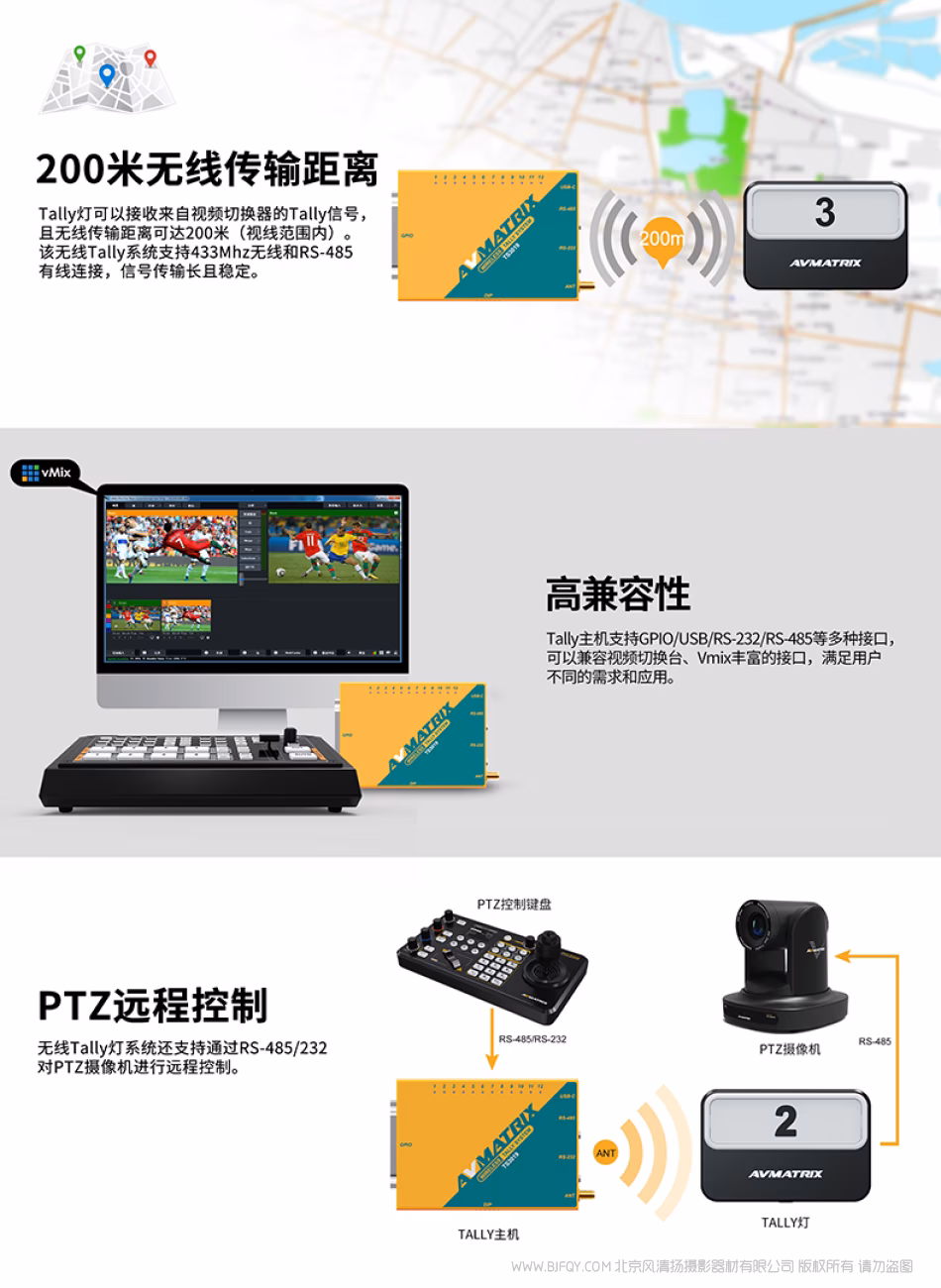 | 应用支持 | 支持Vmix等导播软件, 具有GPIO-tally接口的视频切换台,如AVMATRIX,Roland,SONY,NewTek,Panasonic,DataVideo 或者配合带有GPIO的Tally转换盒,如BMD的GPI和Tally Interface | |