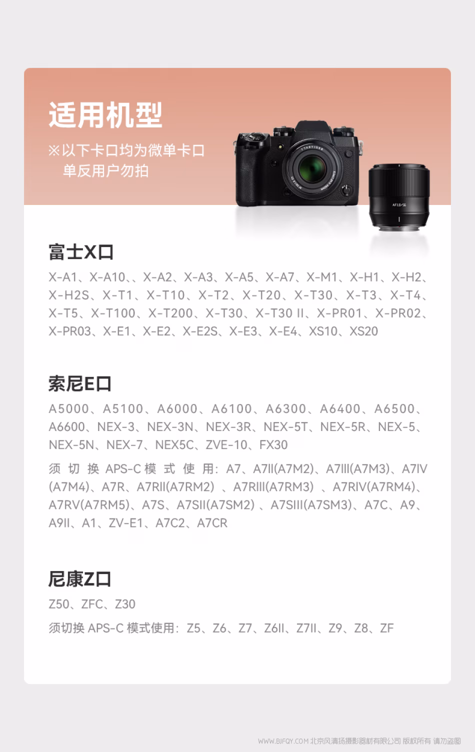 索尼E口 | A5000、A5100、A6000、A6100、A6300、A6400、A6500、A6600、NEX-3、NEX-3N、NEX-3R、NEX-5T、NEX-5R、NEX-5、NEX-5N、NEX-7、NEX5C、ZVE-10、FX30 须切换APS-C 模式使用:A7、A7ll(A7M2)、A7lll(A7M3)、A7lV(A7M4)、A7R、A7Rll(A7RM2) 、A7Rlll(A7RM3) 、A7RlV(A7RM4)、A7RV(A7RM5)、A7S、A7SII(A7SM2) 、A7SIII(A7SM3)、A7C、A9、A9II、A1、ZV-E1、A7C2、A7CR 注意:本镜头在 ILCE-3000 和 ILCE-3500 机型上无法支持AF-C连续自动对焦 | |