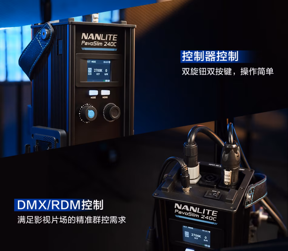 | 控制方式 | 灯体操控,2.4G,蓝牙, DMX/RDM(连线方式:3.5mm音频插口) NANLINK APP | 灯体操控,2.4G,蓝牙, DMX/RDM(连线方式:3.5mm音频插口) LumenRadio CRMX,NANLINK APP |