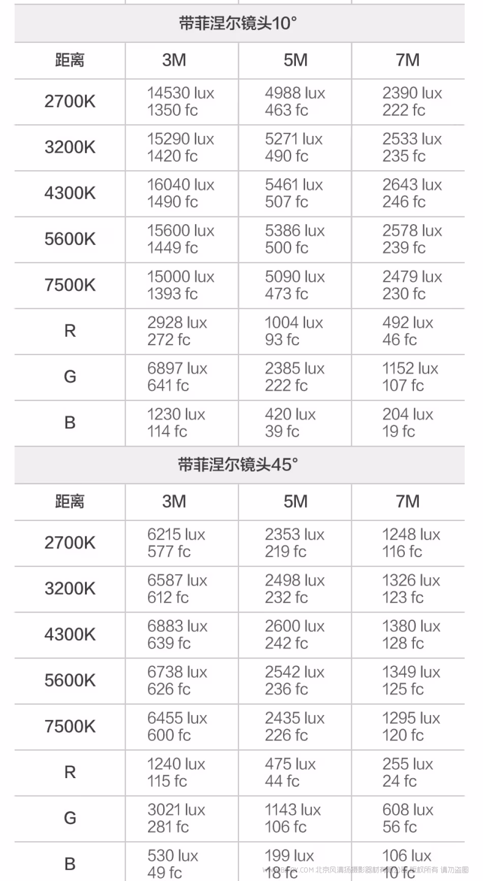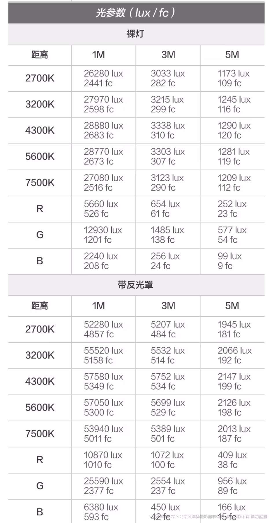 | 3200K | 74660 lux / 6936 fc | 7500 lux / 697 fc | 2712 lux / 252 fc |