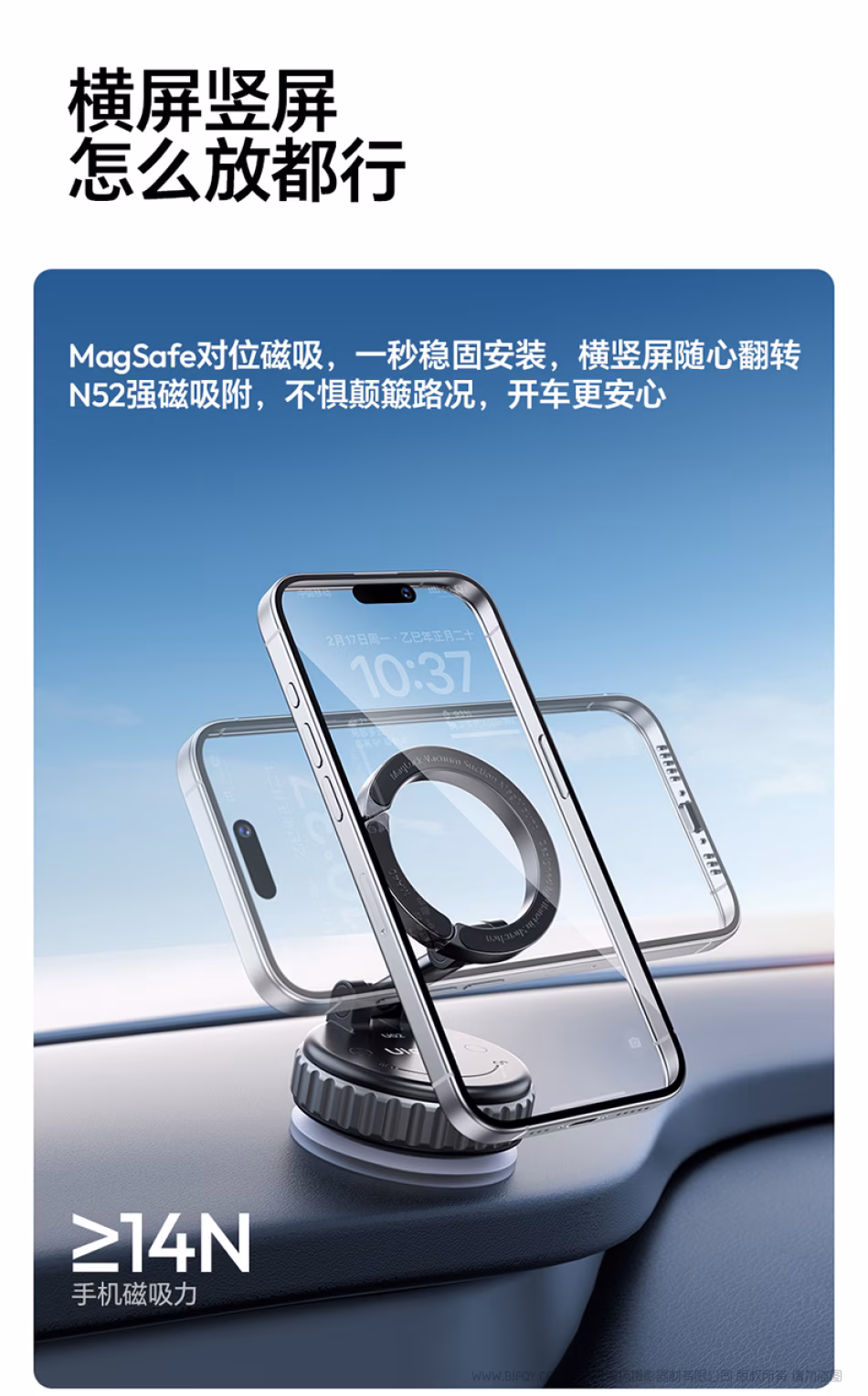 吸力在线,稳如「泰山」 3秒安装 稳固吸附,单手也能操作 一放 放置在安装位置 二锁 旋转锁紧自动排气 三吸 “咔哒”一声稳固吸附