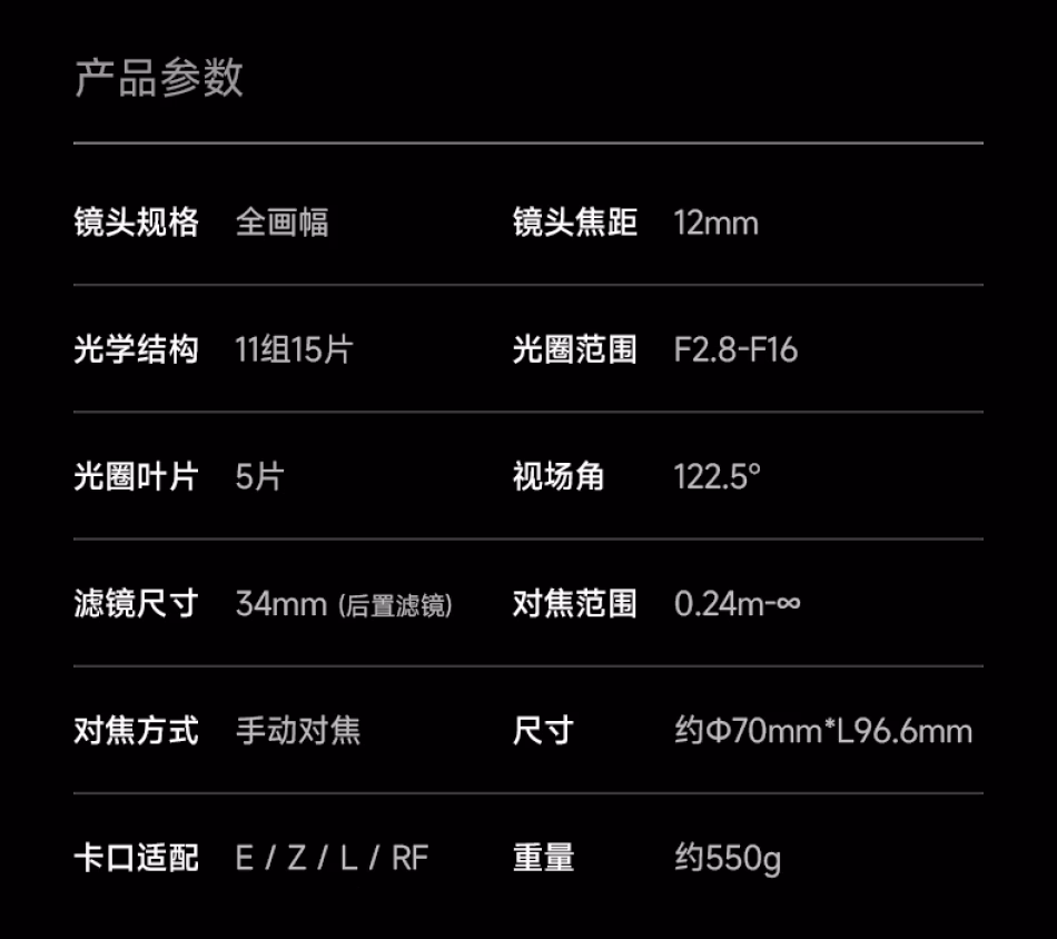 BrightnStar 星曜 星耀 MF 12mm F2.8 ASPH 全画幅 超广角 手动对焦镜头 BS-MF1228