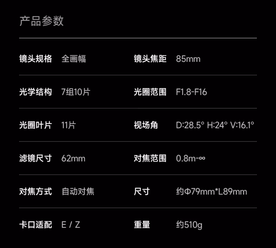 | 卡口适配 | E/Z | 重量 | 约510g |