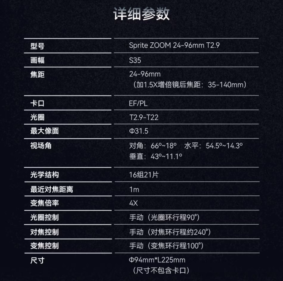 | 型号 | Sprite ZOOM 24-96mm T2.9 |