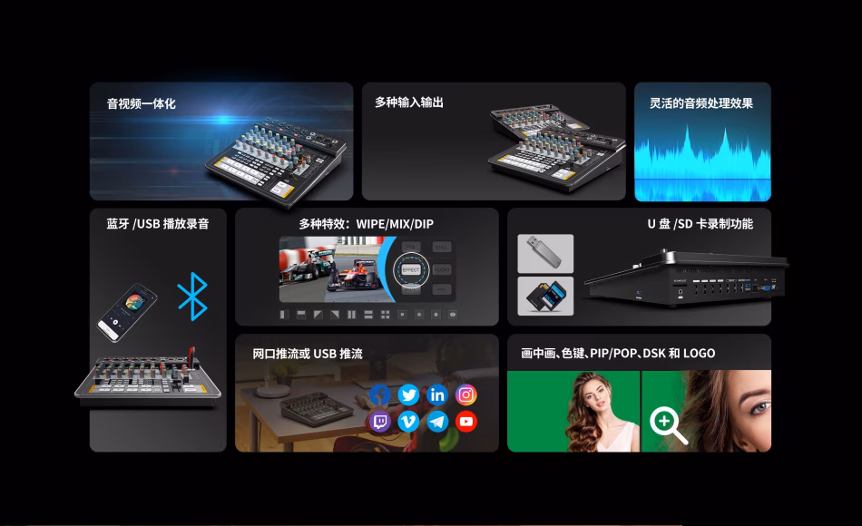 * 亮度键、色度键、PIP×2/POP、DSK和LOGO叠加