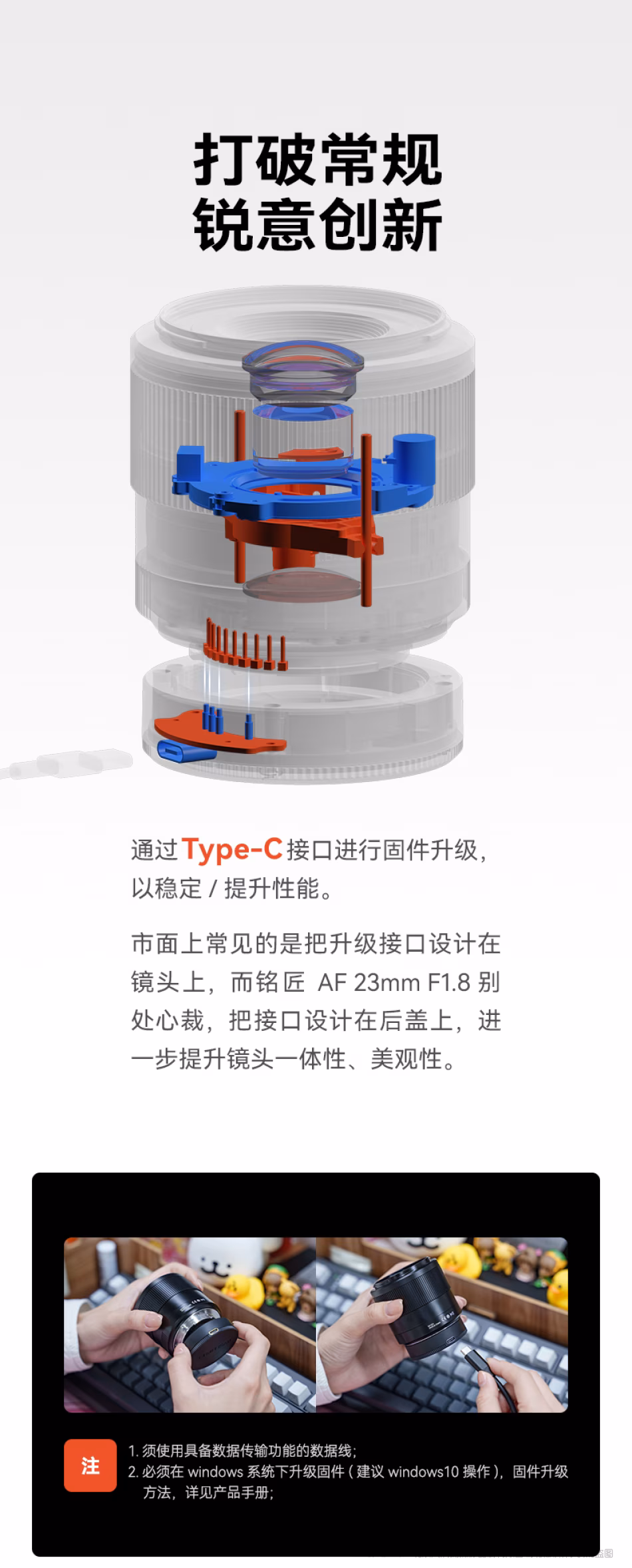 市面上常见的是把升级接口设计在镜头上,而铭匠AF 23mm F1.8 别处心裁,把接口设计在后盖上,进一步提升镜头一体性、美观性。