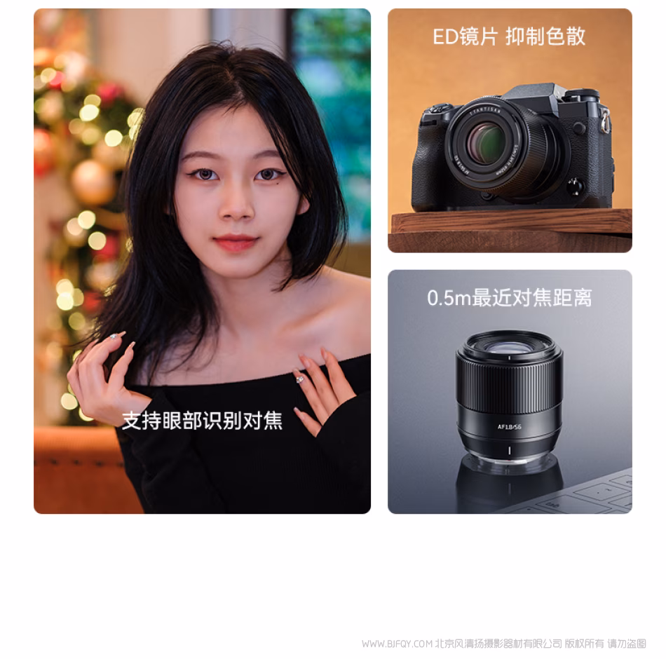 | AF5618-X-B | 6973251732195 | APC-C AF56mm F1.8 富士X | 黑色 | 画幅:半画幅 对焦方式:自动 较近对焦:0.5m 滤镜尺寸:56mm 视角:28° 光学结构:9组10片 重量:约233~245g | |