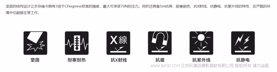 *4. 该数据为内部测试环境下得到的与CFexpress Type B标准的对比结果,并不能保证本CFexpress Type B存储卡在实际使用中,千同等条件下不出现破损和数据丢失。