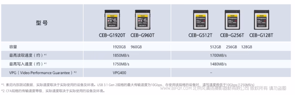 *1. 对于CEB-G960T和CEB-G1920T,基于索尼测试。较高速度取决于使用的相机型号和使用环境。