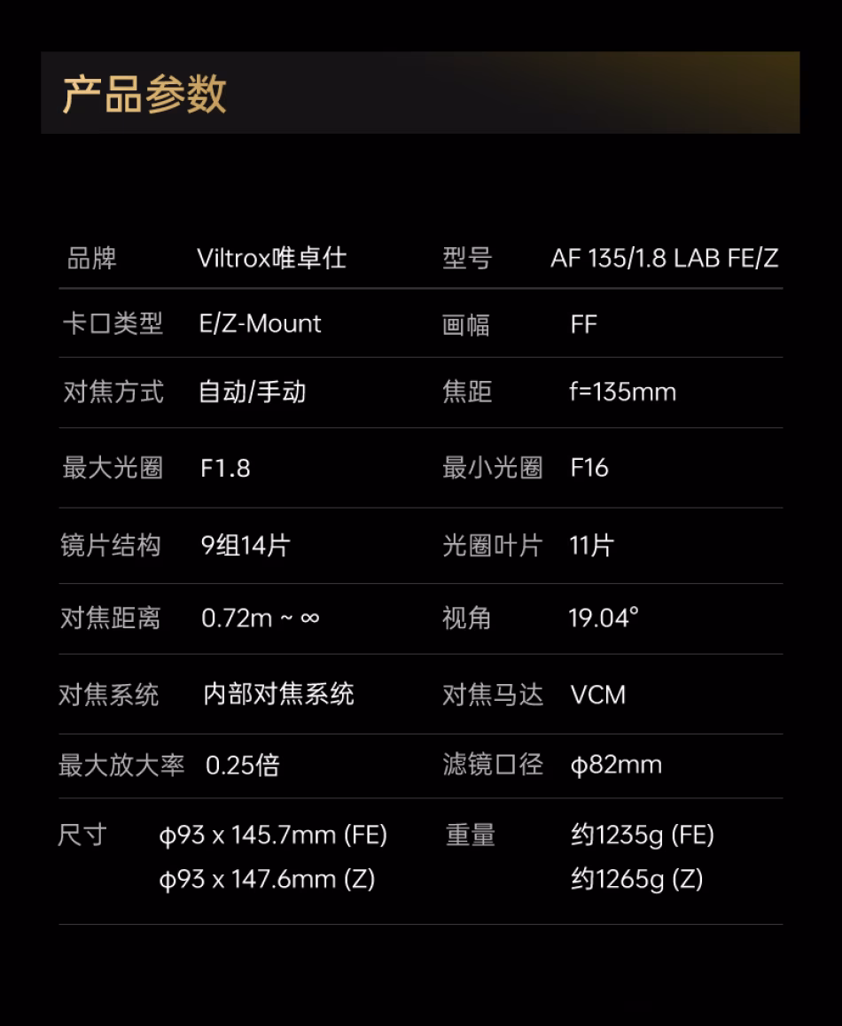唯卓仕 Viltrox AF 135mm F1.8 LAB FE/Z 全画幅 标准自动对焦镜头 【探索系列】 索尼尼康微单适用 VL-AF13518LAB-E/Z
