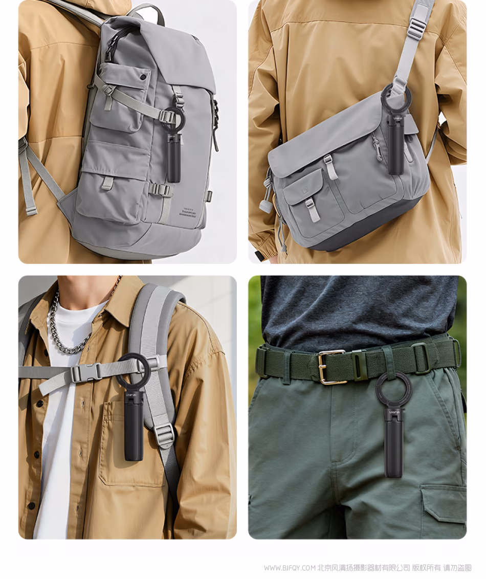 一扣快挂想拍就拍 登山扣设计,轻松挂在包上, 解放双手,随时随地想拍就拍