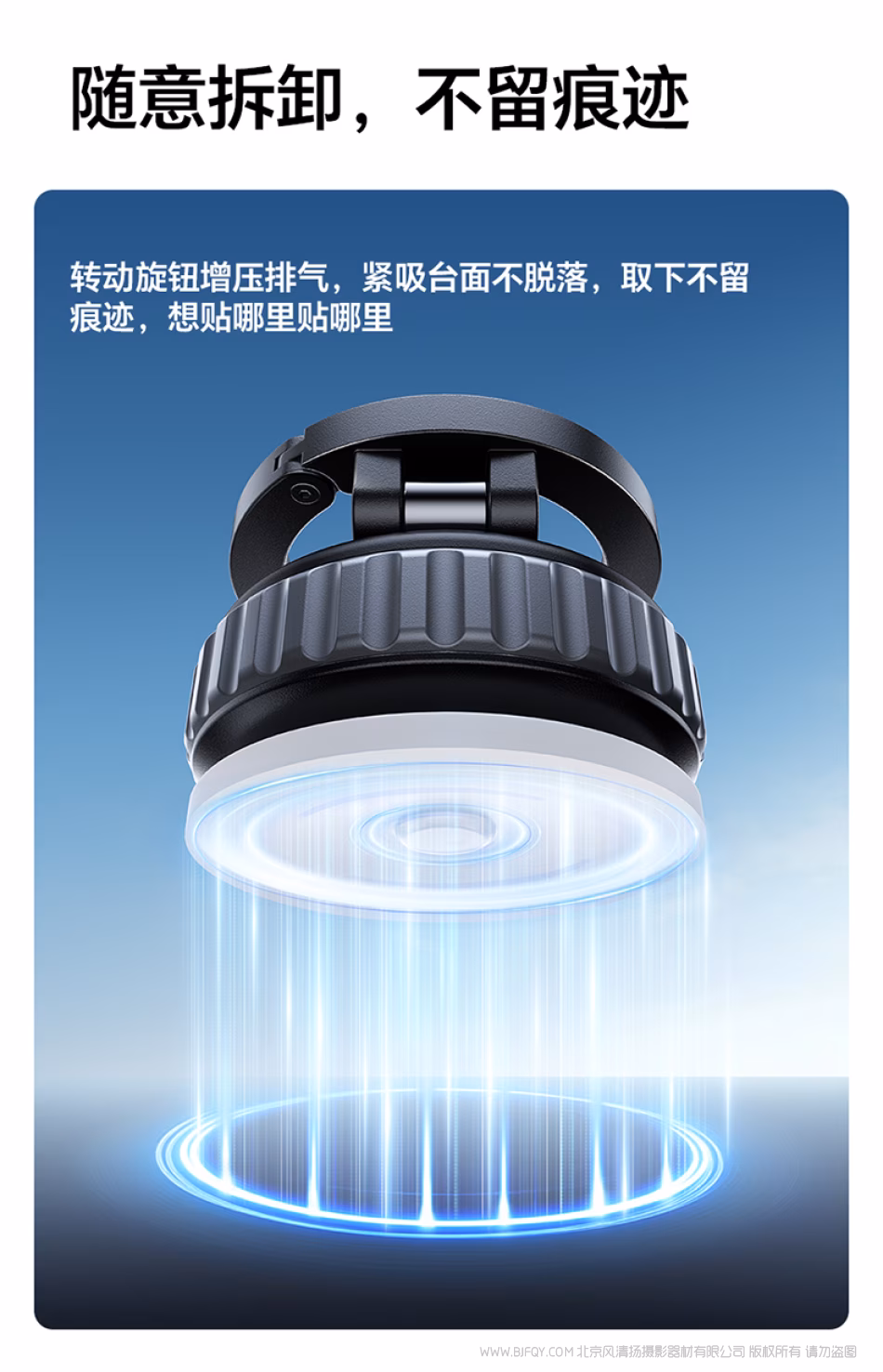 吸力在线,稳如「泰山」 3秒安装 稳固吸附,单手也能操作 一放 放置在安装位置 二锁 旋转锁紧自动排气 三吸 “咔哒”一声稳固吸附
