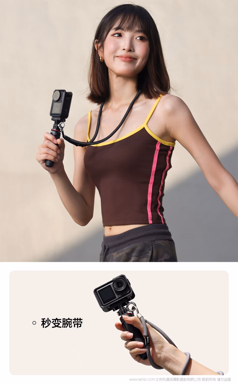 骑行挂脖 Sm *设备、三脚架及官配底座需另备 抬手即拍,尽情奔跑 抬手即刻抓拍风景,肆意跑动 防丢防摔,无惧颠簸